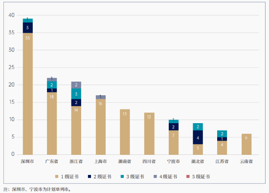 在地域分布方面,获证最多的前 10 个省市主要分布在长三角和珠三角。此外,华中地区的湖南省、湖北省及西南地区的四川省、云南省也表现突出。广东省和浙江省在分级评价工作中表现尤为活跃,获证数量位居前列。