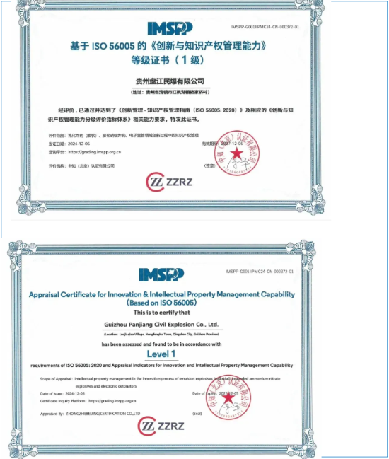 近期,贵州盘江民爆有限公司(简称“”盘江民爆)成功获得中知(北京)认证有限公司颁发的基于ISO 56005的《创新与知识产权管理能力》等级证书(1级),成为全国民爆行业第一家取得该证书的公司。这一殊荣标志着盘江民爆在创新和知识产权管理领域达到了行业领先水平。