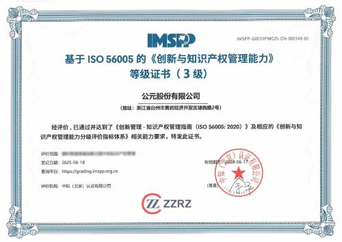 近日,公元股份有限公司(下称“公元股份”或“公司”)顺利通过ISO 56005国际标准分级评价,获得中知(北京)认证有限公司颁发的《创新与知识产权管理能力》等级证书(3级),标志公司的创新与知识产权管理已达到国际领先水平。