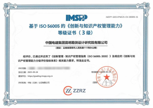 近日,中国电建集团昆明勘测设计研究院有限公司(下称“中国电建昆明院”或“公司”)正式获得中知(北京)认证有限公司颁发的基于ISO 56005的《创新与知识产权管理能力》等级证书(3级),成为电建集团内首家、云南省第四家获3级证书的单位,标志着昆明院在知识产权与创新融合管理方面达到国内先进水平。