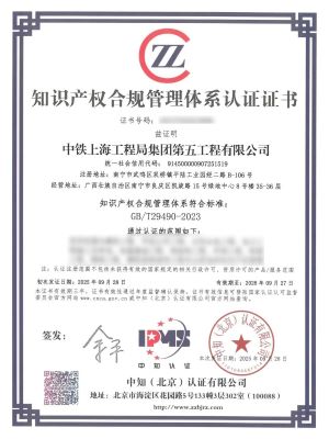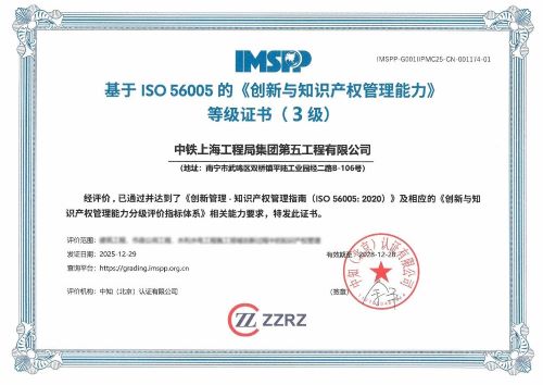 近日,中铁上海工程局集团第五工程有限公司(下称“公司”)成功通过中知(北京)认证有限公司的权威评价,荣获基于ISO 56005《创新与知识产权管理能力》等级证书(3级),在此之前公司已获得了中知公司颁发的知识产权合规管理体系认证证书。其中,ISO 56005三级证书为广西建筑业首张、自治区第二张,标志着公司在创新与知识产权管理领域迈入国际先进行列,为实现国际国内标准“双轮驱动”、争创国家知识产权示范企业奠定了坚实基础。