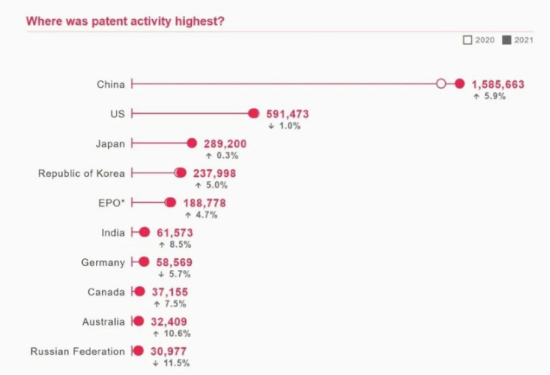 世界各地的创新者提交了340万份专利申请,同比增长3.6%。中国的申请数量大幅增加,申请数量比2020年多88504件,韩国申请数量比2020年多11239件,欧洲申请数量比2020年多8432件,是2021增长的主要驱动力。印度申请数量比2020年多4802件,南非申请数量比2020年多4272件。