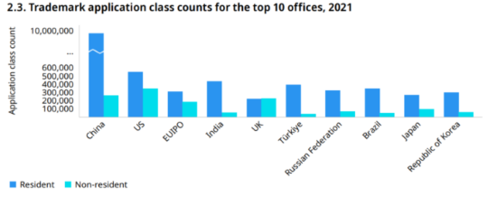 排名前20位中,有18个主管局的商标申请活动量有所增长,有11个主管局在2021年实现了两位数的增长,从韩国的12.7%到英国的61.8%不等。