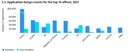 其次是欧盟(117,049项)、英国(74,781件)、韩国(69,248件)和土耳其(65,924件)。由于英国脱欧,其在2021年受理的外观设计申请比2020年增加了2.3倍,是外观设计申请数量方面在2021年第三活跃的主管局,在世界排名中上升了4位。