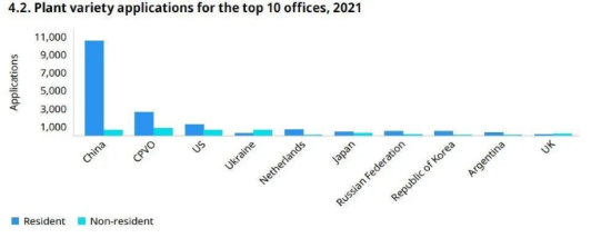 2021年,全球共提交了约25,340项植物新品种申请,较2020年增长了12%。中国在2021年受理了11,195件植物新品种申请,约占全球总量的44.2%。其后依次是欧洲(3,480件)、美国(1,902件)、乌克兰(944件)和荷兰(836件)。