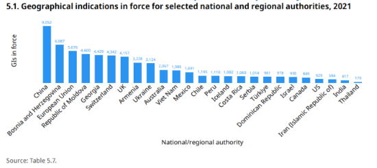 2021年,全球93个国家和地区共有约63,600个受保护的有效地理标志。中国(9,052)有效地理标志数量最多,其次是匈牙利(7,743)、捷克(6,272)、斯洛伐克(6,112)以及波斯尼亚和黑塞哥维那(6,087)。